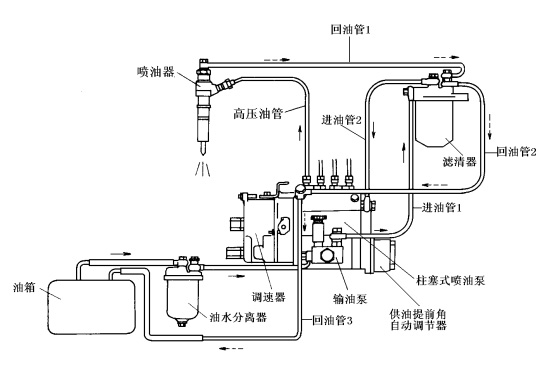 柱塞式噴油泵一般由柴油機(jī)曲軸的正時(shí)齒輪驅(qū)動(dòng)。固定在噴油泵體上的輸油泵由噴油泵的凸輪軸驅(qū)動(dòng)。輸油泵從油箱中吸油經(jīng)管路壓入高壓泵,高壓泵提高壓力后送入噴油器,噴油器將油噴入氣缸。油的流動(dòng)路線如下: